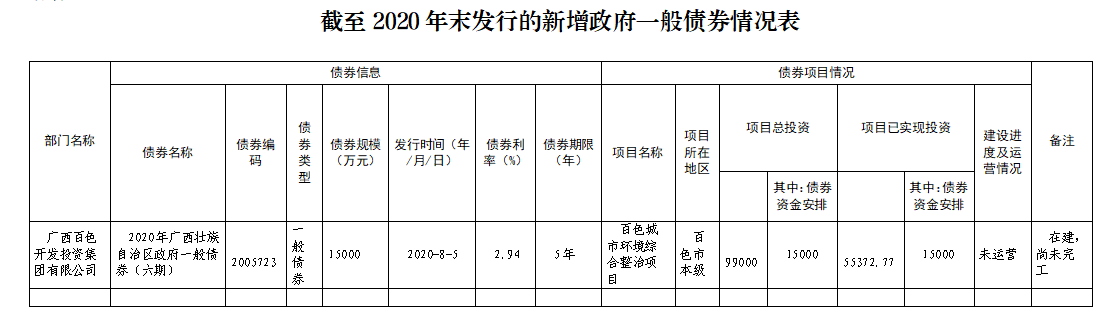 根據(jù)《廣西壯族自治區(qū)財政廳關(guān)于做好新增政府債券存續(xù)期內(nèi)信息公開有關(guān)工作的通知》(桂財債〔2021〕63號)和《廣西壯族自治區(qū)財政廳關(guān)于印發(fā)廣西政府債務信息公開實施細則的通知》(桂財規(guī)〔2019〕1號)等有關(guān)要求,現(xiàn)將我司新增政府債券存續(xù)期內(nèi)信息公開如下(信息收集截止時間為2020年末)